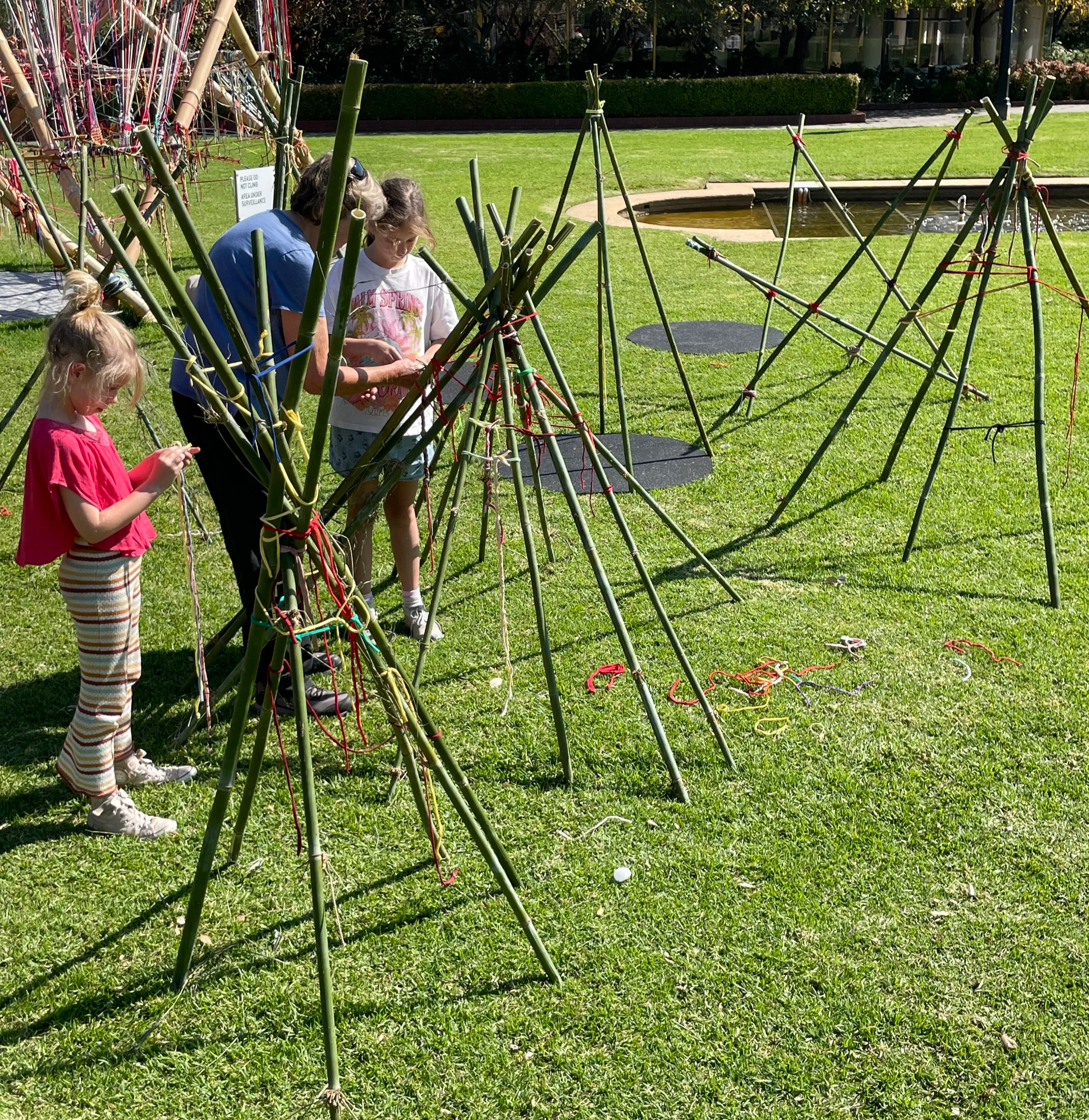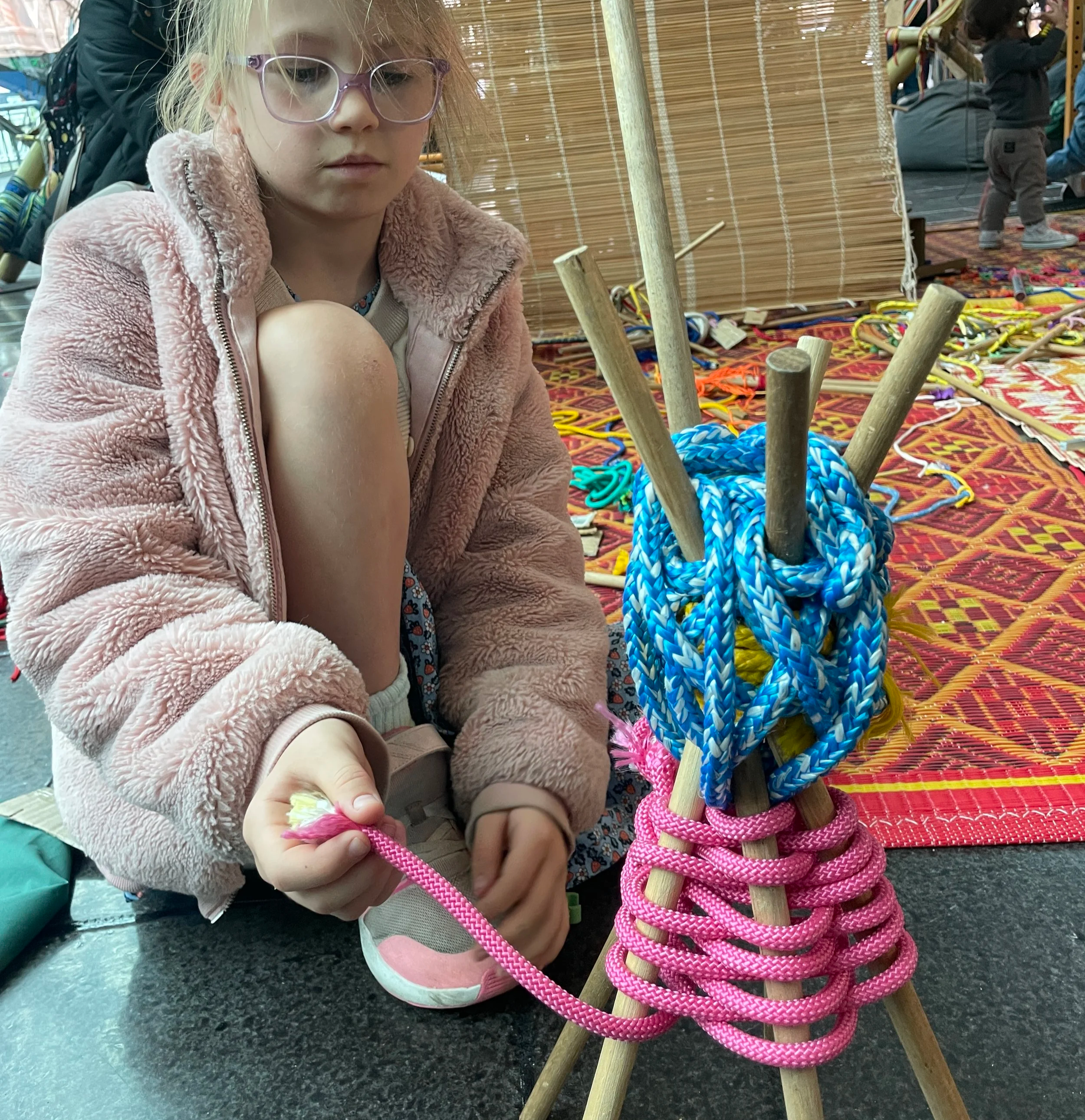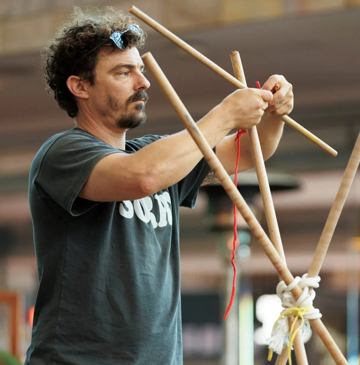 Our signature workshop is an immersive experience in collaborative architecture. Visitors are invited to interact with our monumental loom installation or start their own structural projects using timber stakes, rope, and yarn.From basic knots to intricate joints, we teach the "slow" skills needed to transform simple materials into complex forms. Join us to build, weave, and connect within an ever-changing communal space.